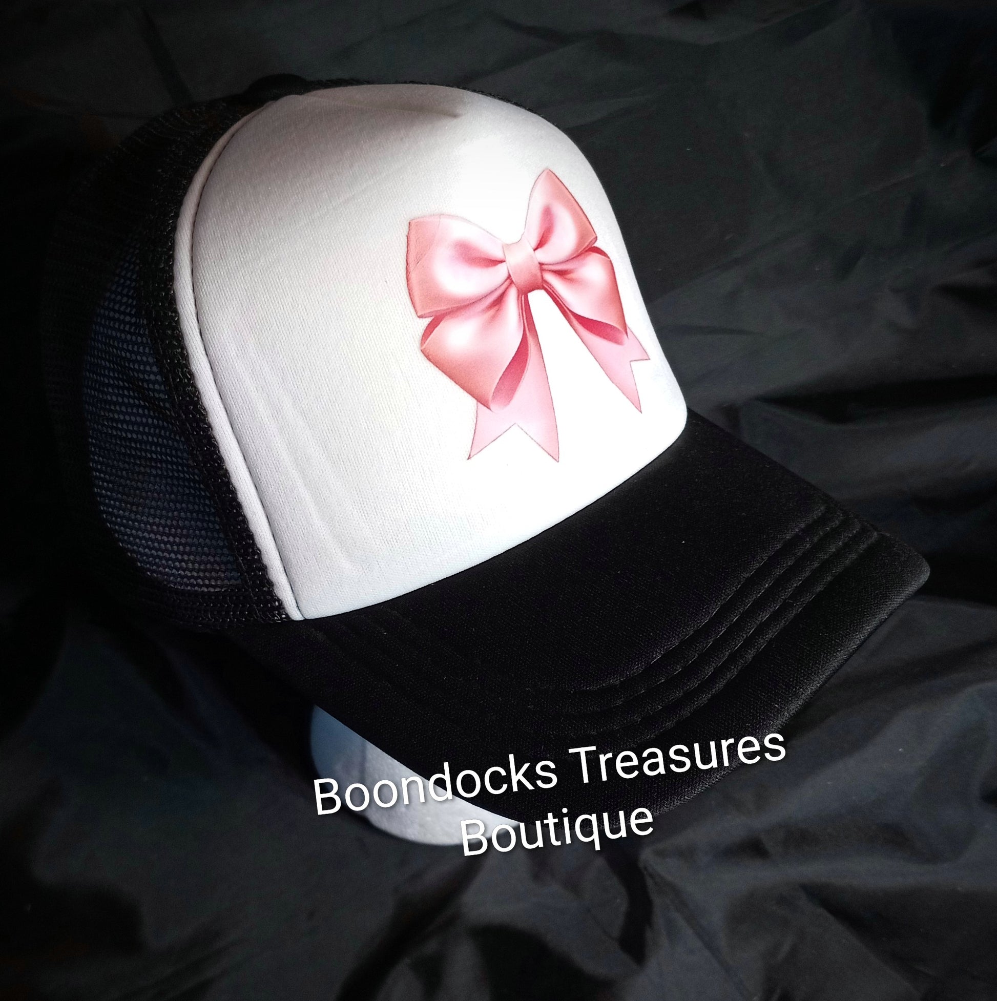 "Pink Coquette Bow" DTF transfer embellished in- house on Black 🖤 Trucker Hat
