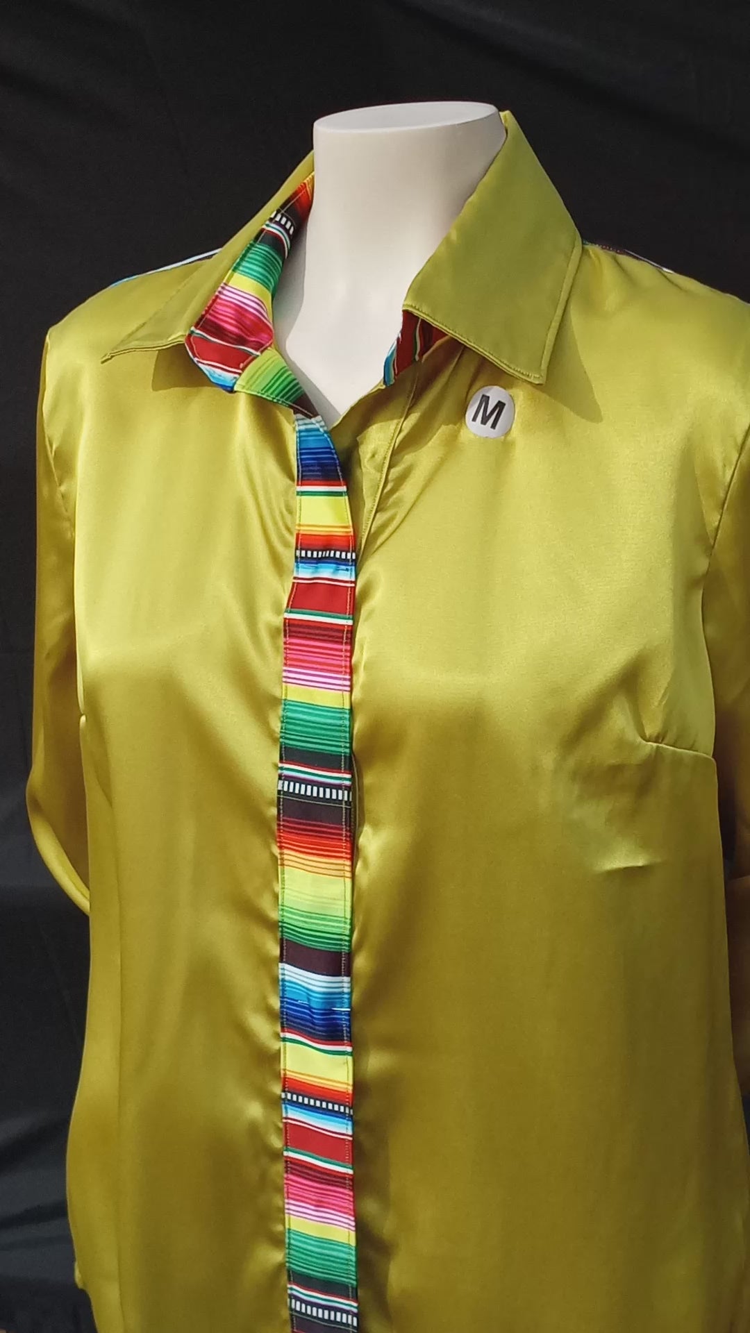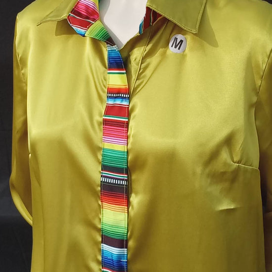 This listing is for my handmade chartreuse satin shirt with sarape accents. My products are generally made to order since I work out of my home and do not have a large amount of space for inventory storage.