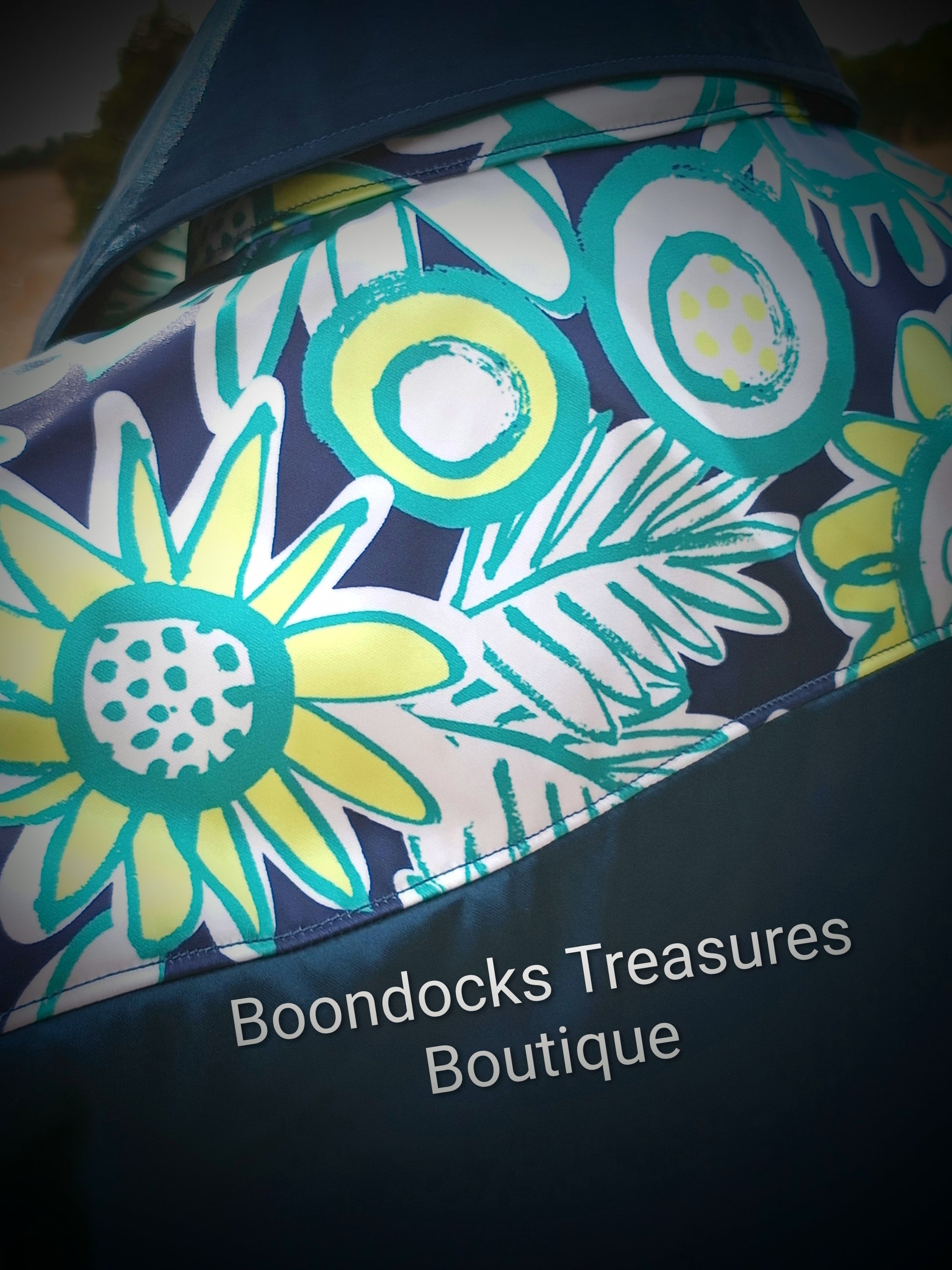 Navy blue satin shirt w/ "Hula Flowers"/drawn sunflowers print ACCENTS- Women's and Teen's Handmade Button up Shirts Pearl Snap Shirts Western Shirts Rodeo Shirts Show Shirts