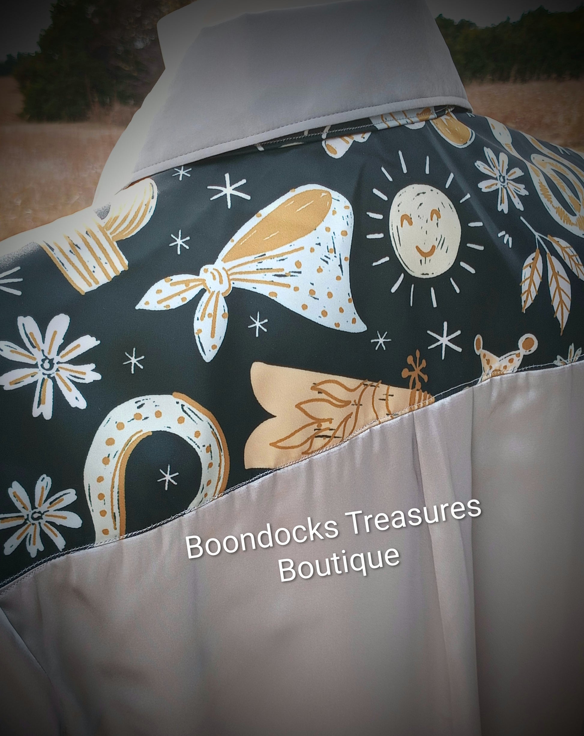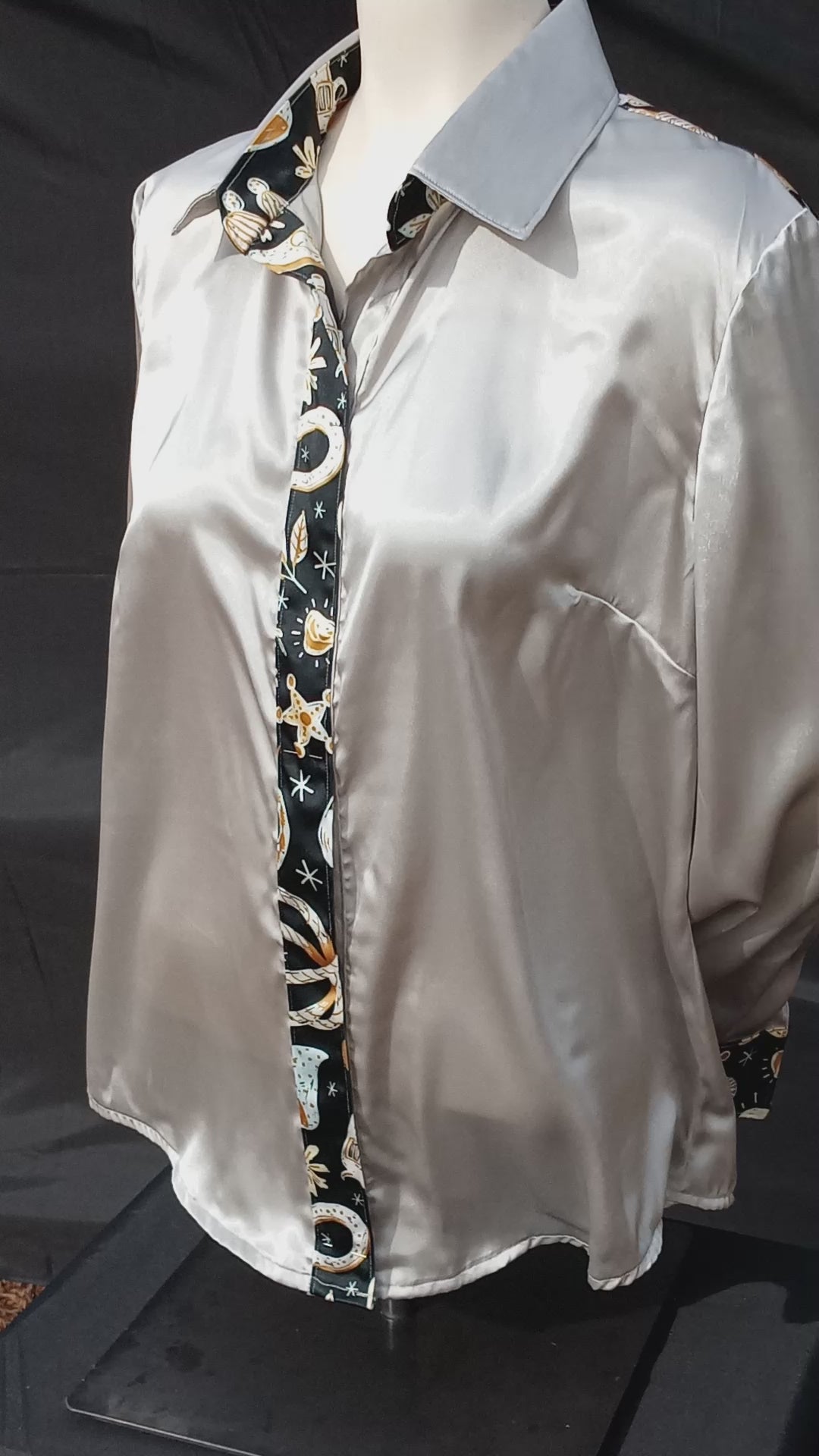 PLATNIUM-SILVER satin shirt w/ "COWBOY DOODLES" print ACCENTS- Women's and Teen's Handmade Button up Shirts Pearl Snap Shirts Western Shirts Rodeo Shirts Show Shirts
