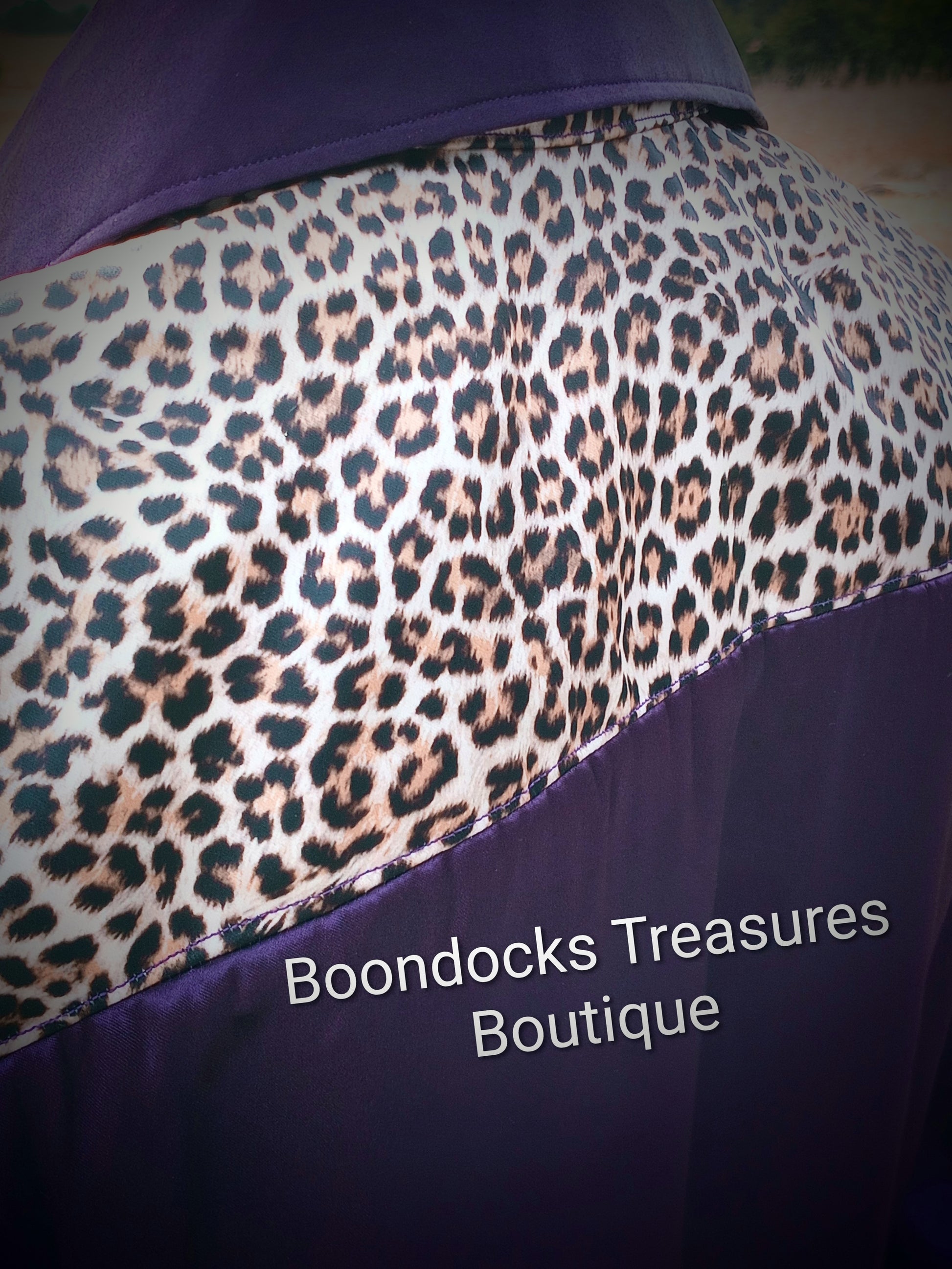 Purple satin shirt w/ light leopard print ACCENTS- Women's and Teen's Handmade Button up Shirts Pearl Snap Shirts Western Shirts Rodeo Shirts Show Shirts