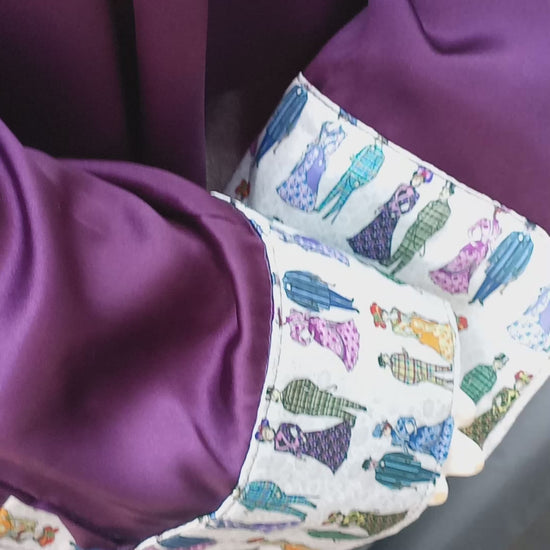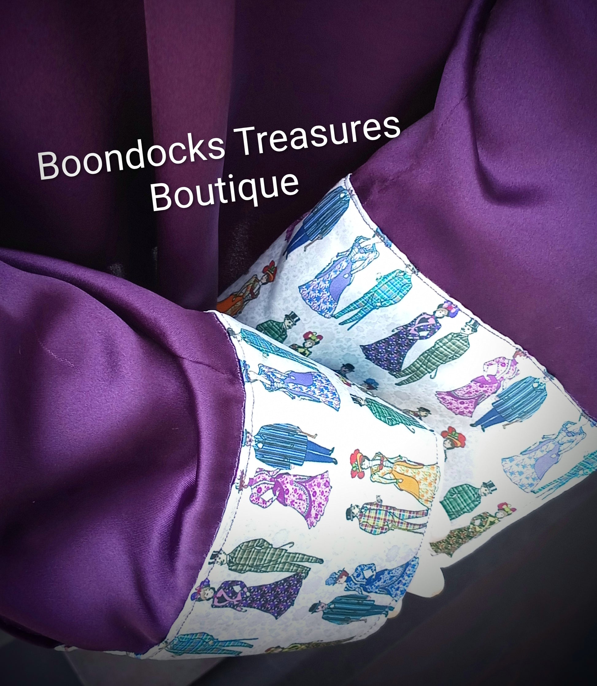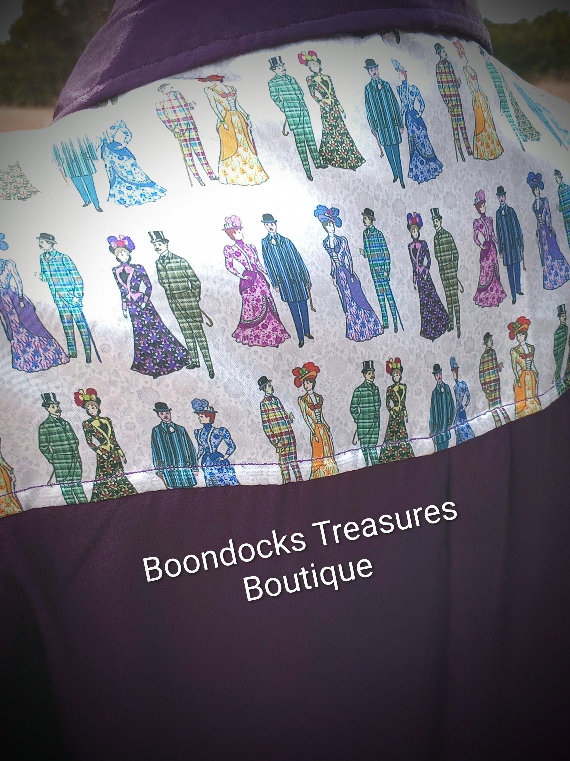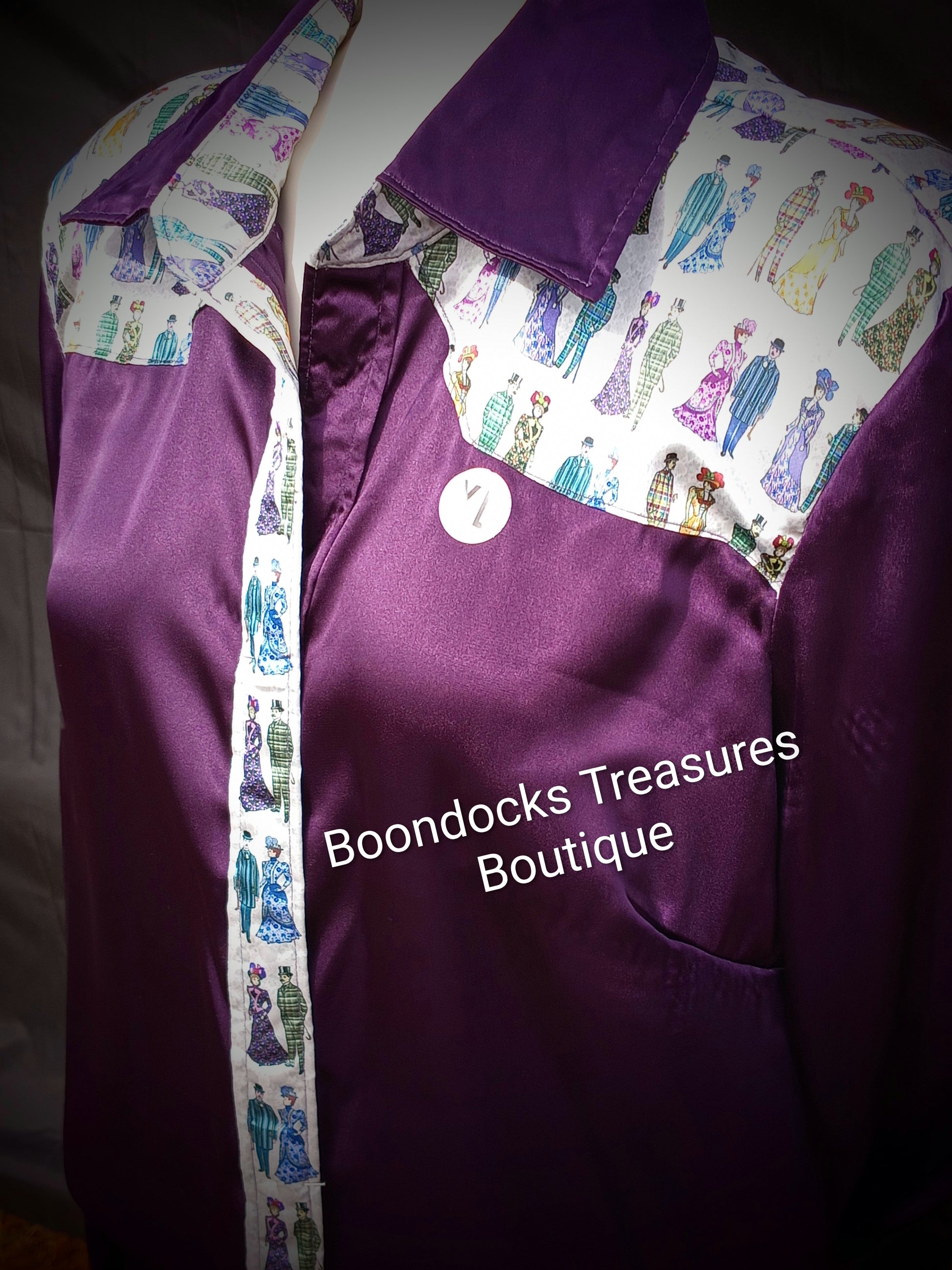 Purple satin shirt w/ Victorian Fashion print ACCENTS- Women's and Teen's Handmade Button up Shirts Pearl Snap Shirts Western Shirts Rodeo Shirts Show Shirts