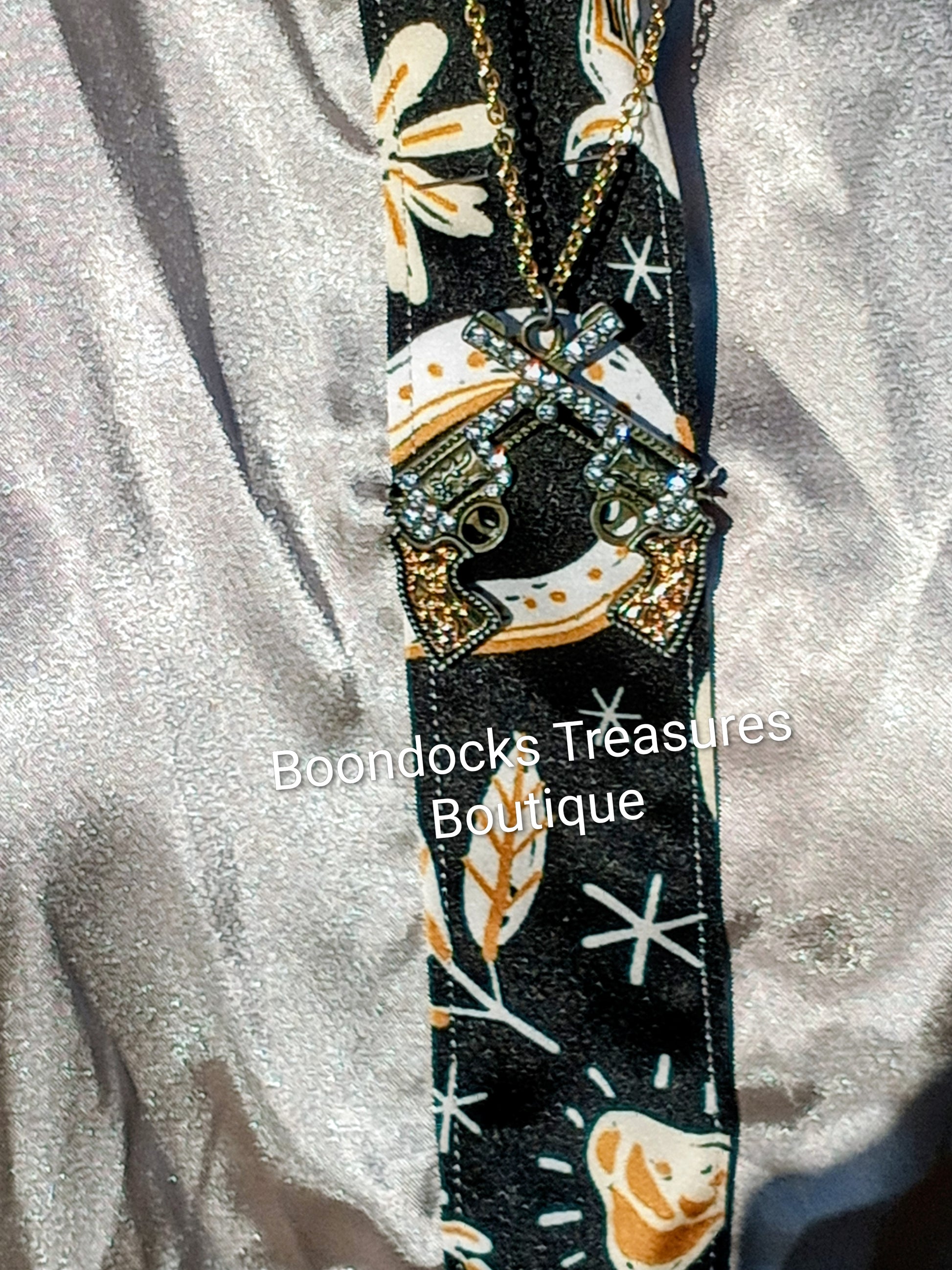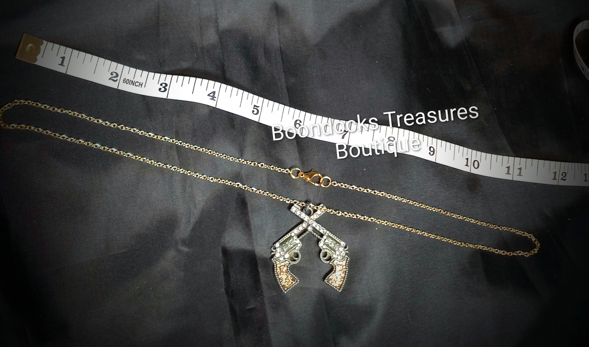 Show off your bold, western style with this handmade dueling pistols pendant necklace. The pendant features two silver pistols adorned with clear and gold rhinestones, making it a striking, eye-catching statement piece perfect for rodeo fans, western enthusiasts, or anyone who loves a rugged, unique accessory.