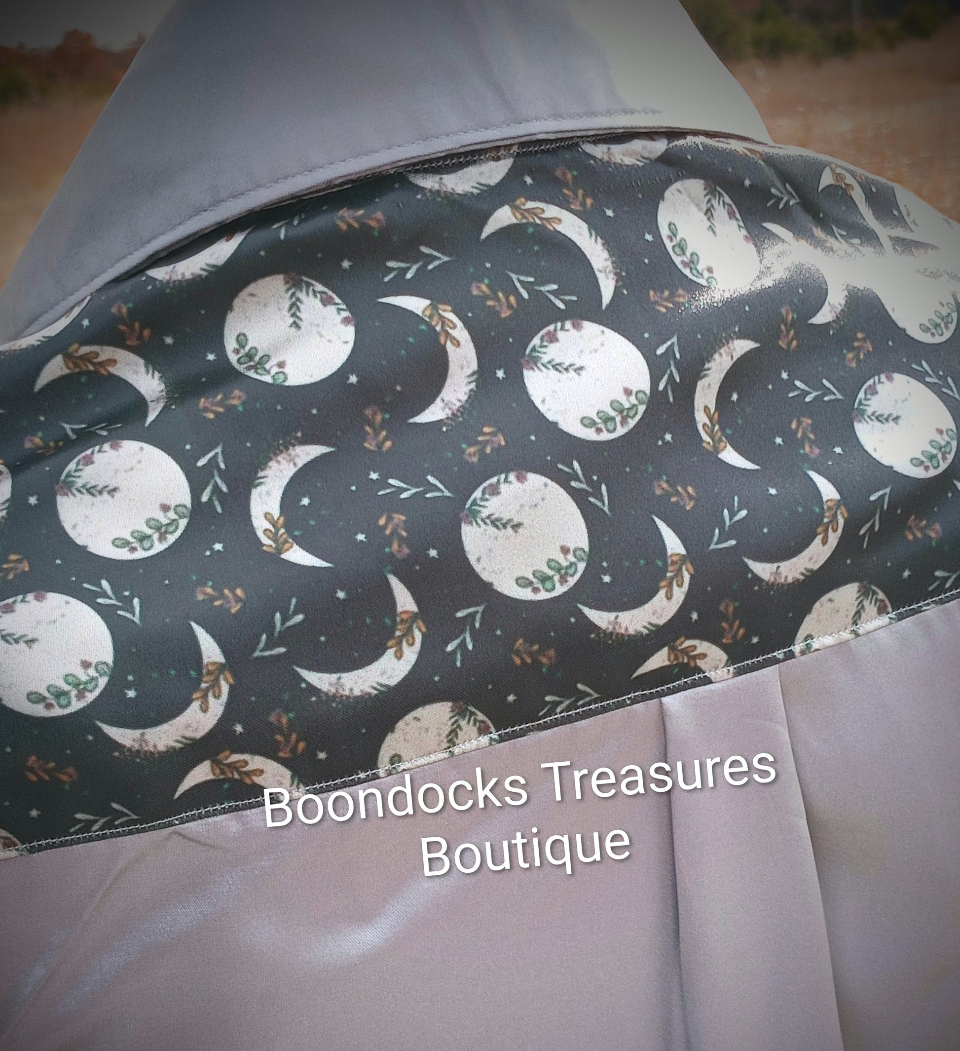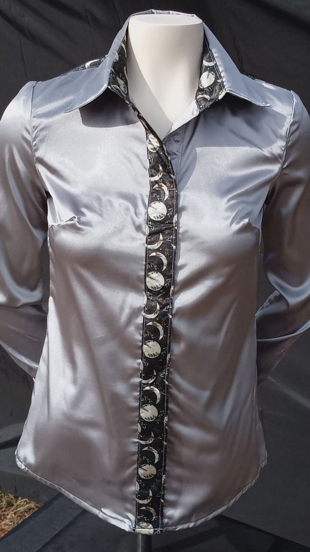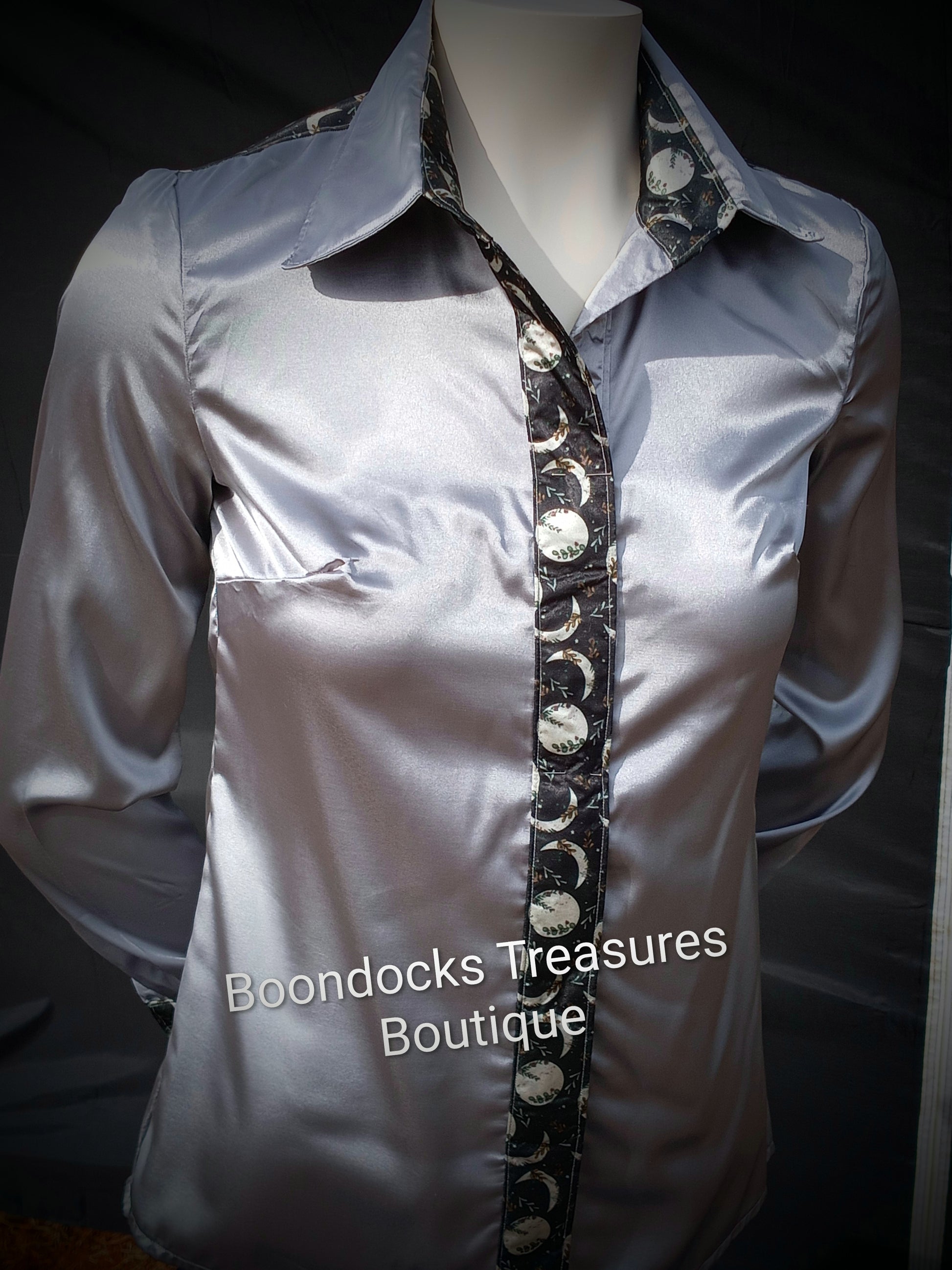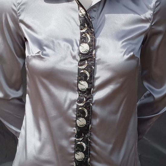 SILVER-GRAY satin shirt w/ MOON PHASES print ACCENTS- Women's and Teen's Handmade Button up Shirts Pearl Snap Shirts Western Shirts Rodeo Shirts Show Shirts