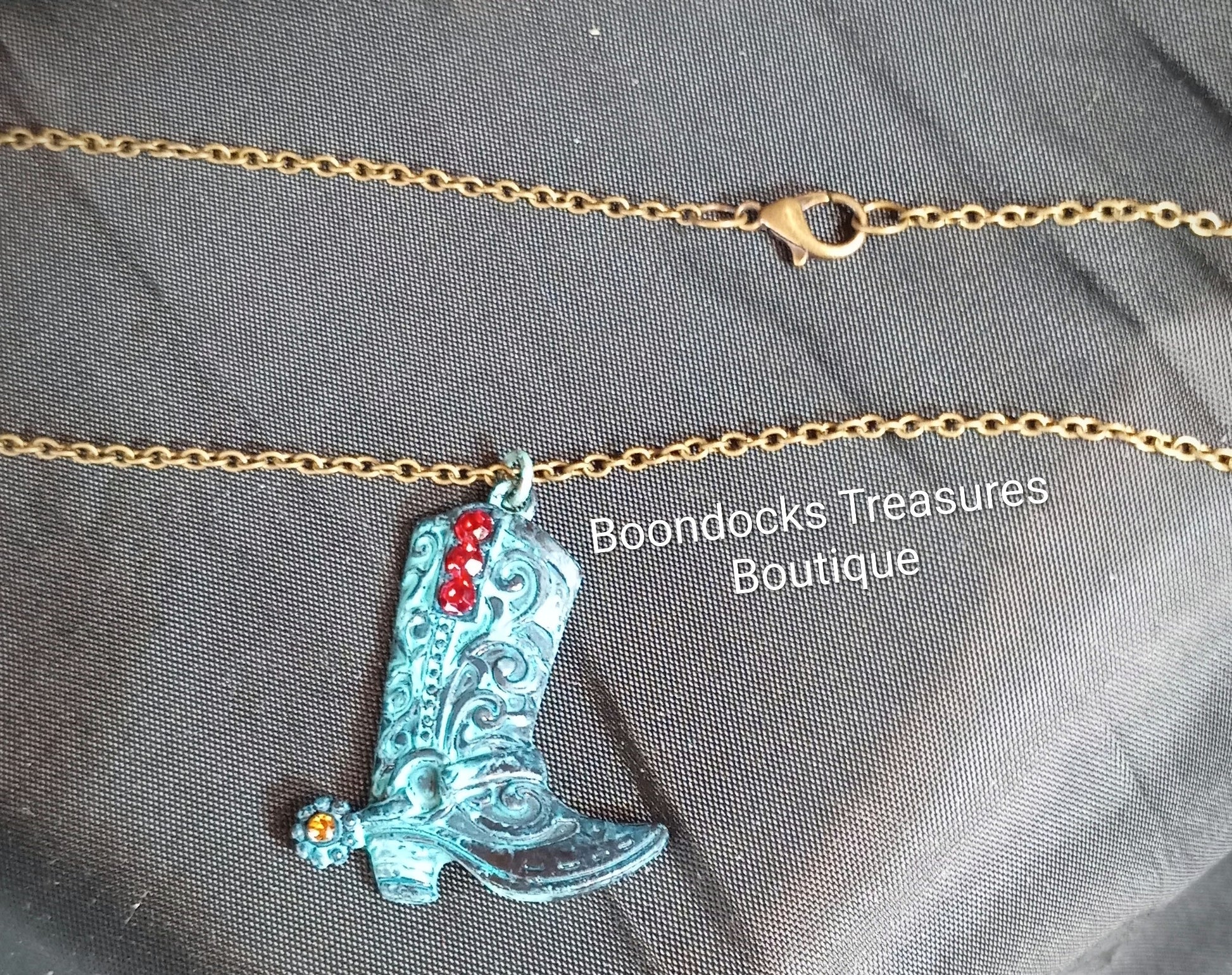 Turquoise 3D Cowboy Boot w rhinestones Pendant Necklace on Antique Brass Chain- Handmade