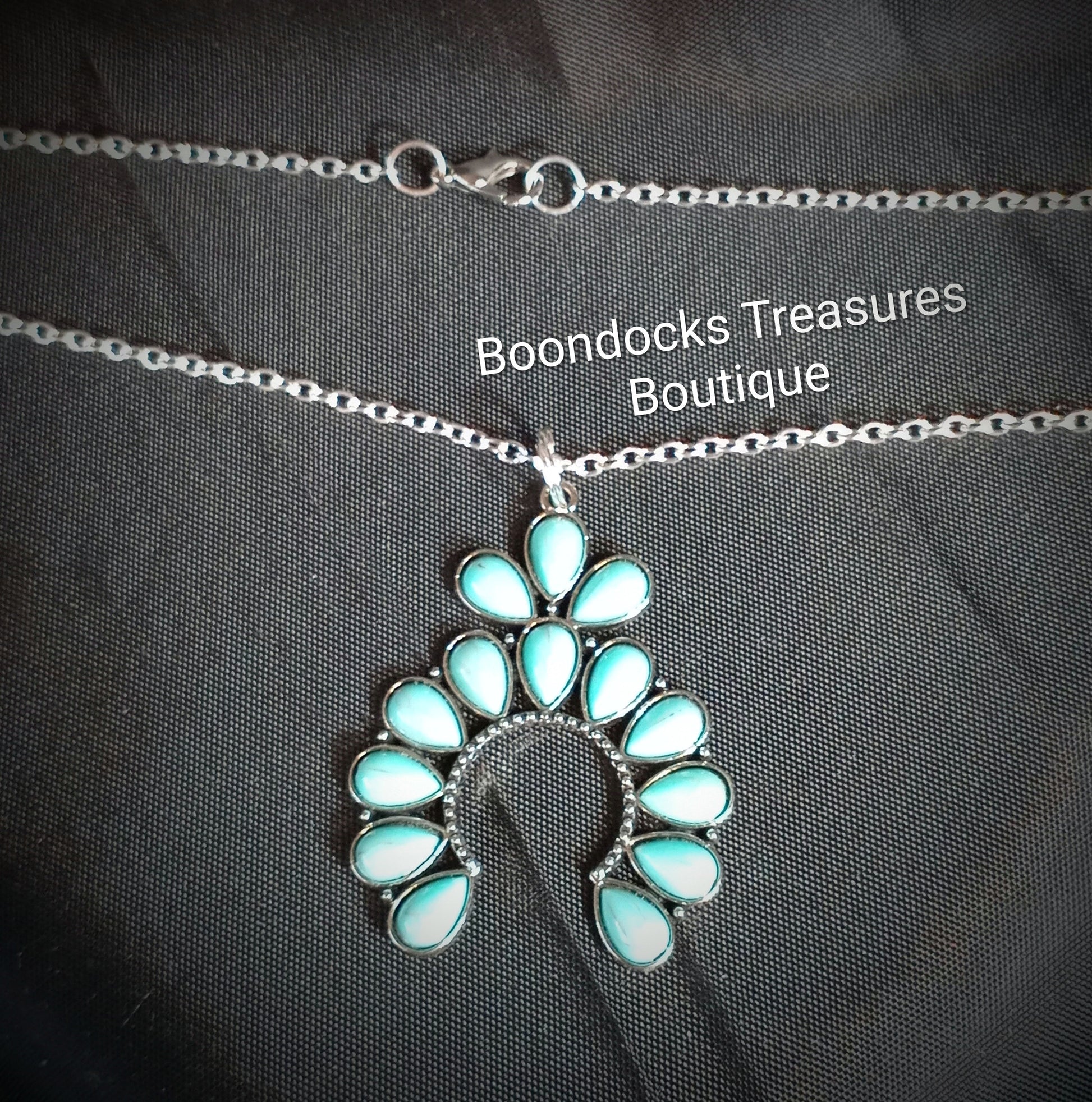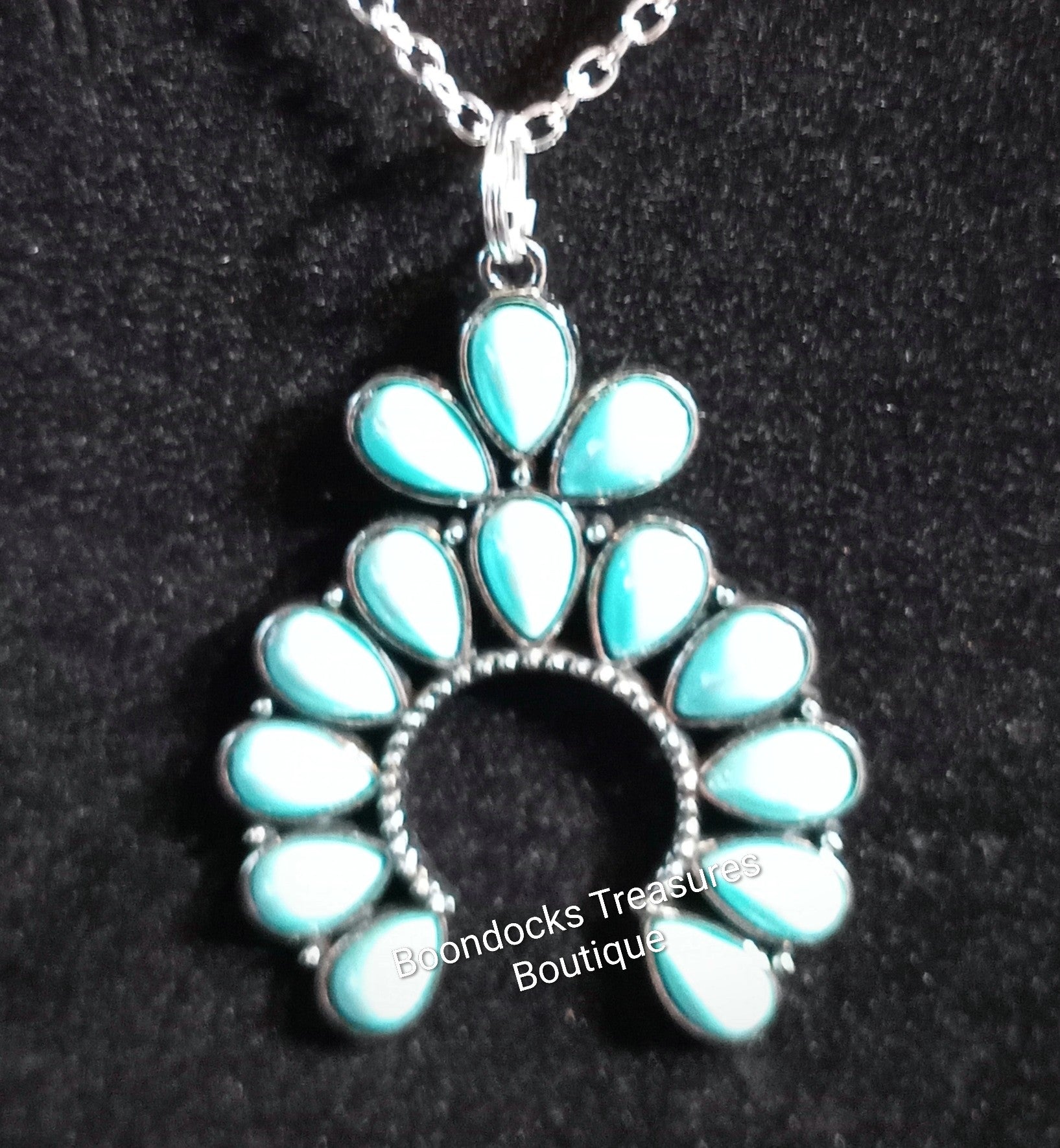 Celebrate southwestern style with this handmade turquoise and silver squash blossom pendant necklace. The striking pendant hangs from a 22" silver chain and showcases classic turquoise accents set in silver, capturing the iconic beauty of western-inspired jewelry.