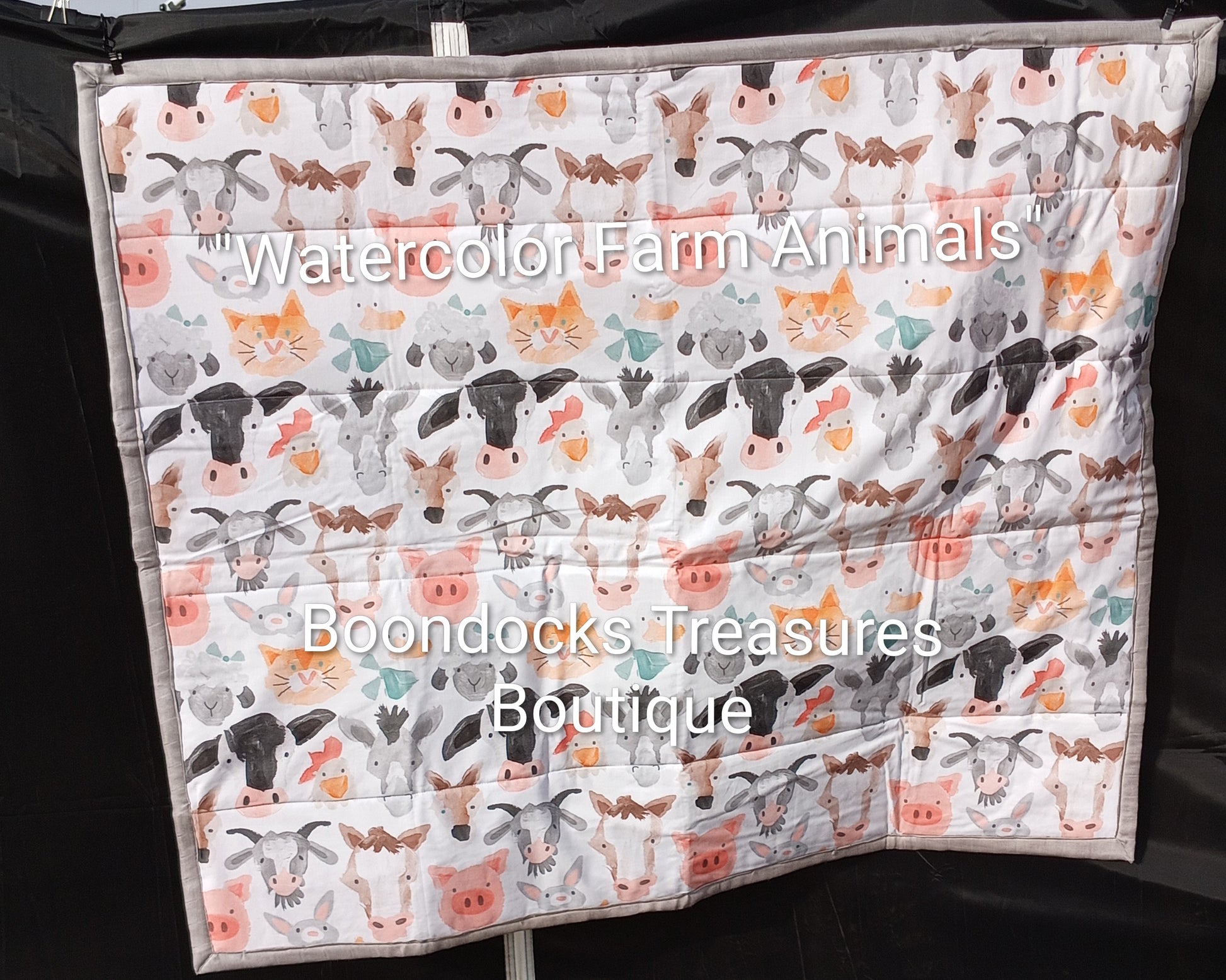 This quilt features cute watercolor farm animals on cotton with a gray bamboo back fabric.
